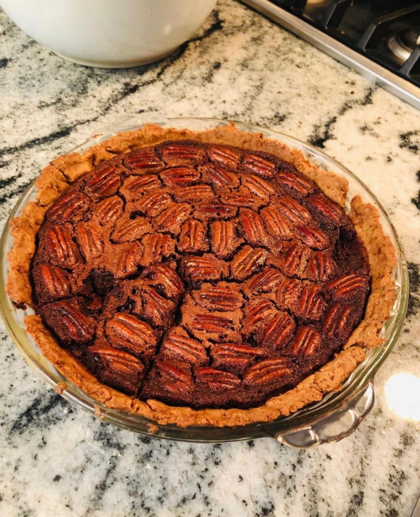 1. Spread the pecans inside the warm pie crust and set aside. Place the chocolate chips or chopped chocolate in a glass bowl and microwave in 30-second increments, stirring between each, until melted.